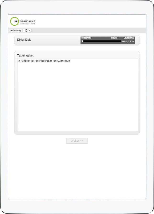 Die Fähigkeit, gesprochenen Inhalt schnell und fehlerlos zu verschriftlichen, ist eine wichtige Kompetenz in allen Berufen, in denen regelmäßig schriftlich kommuniziert wird. Ein Diktat ermöglicht es, Kenntnisse der Rechtschreibung und Zeichensetzung zu überprüfen. Darüber hinaus wird Verarbeitungskapazität bei der Übertragung von gesprochenen in schriftliche Inhalte implizit erfasst.